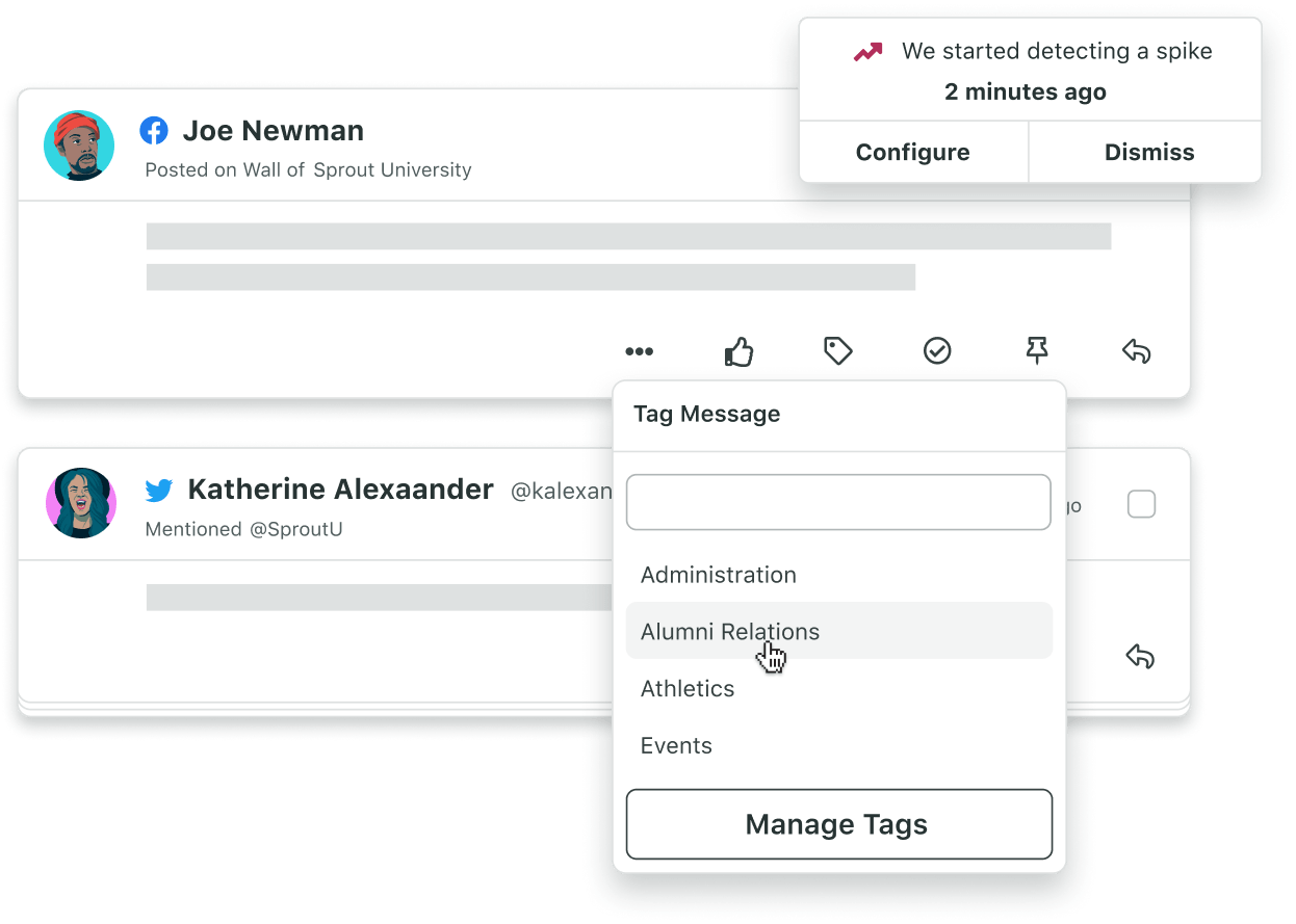 Monitor campus chatter, manage crises and assess brand health with Message Tagging, Spike Alerts and social listening tools.