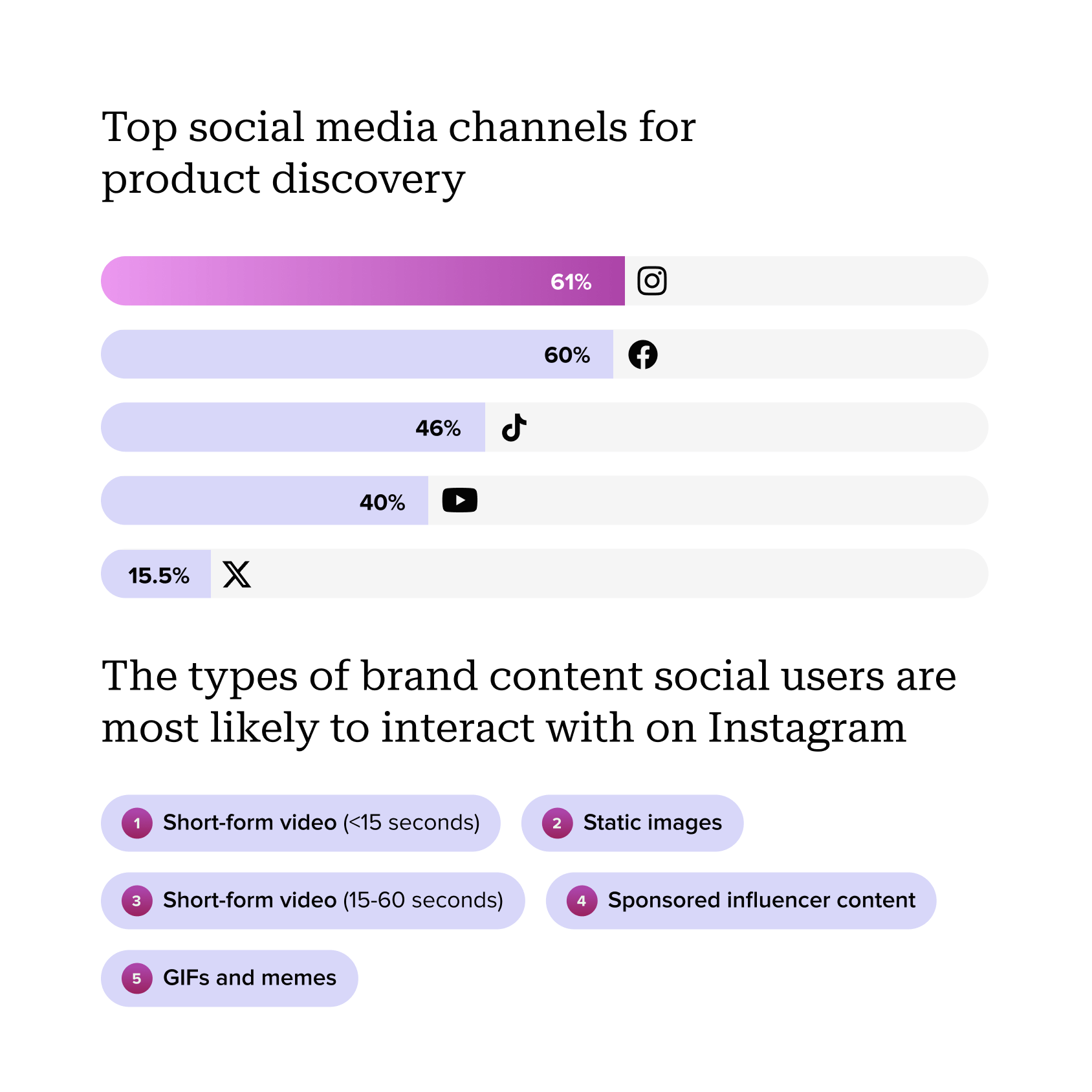 The top social media channels for product discovery: Instagram, Facebook, TikTok, YouTube and X.
